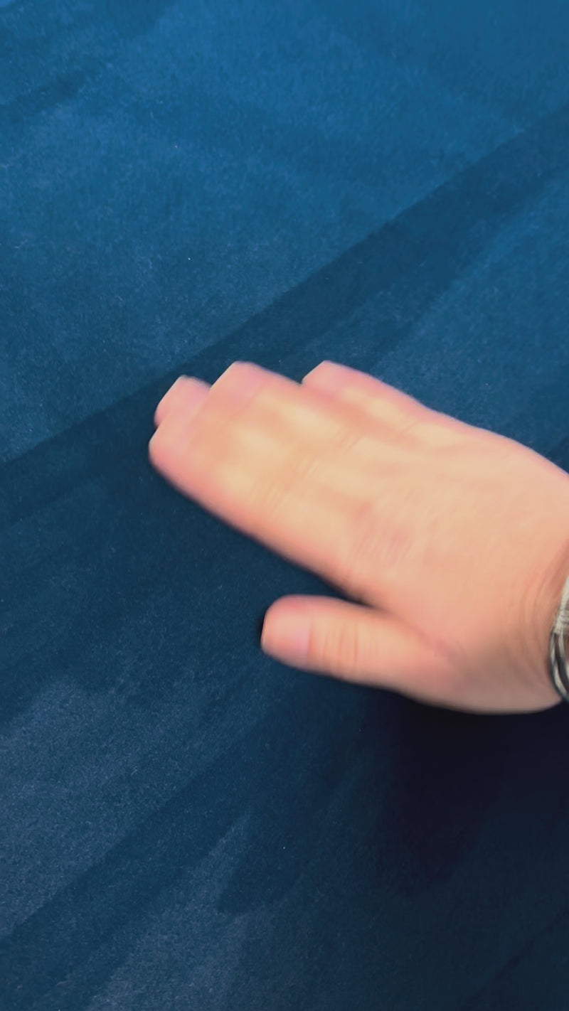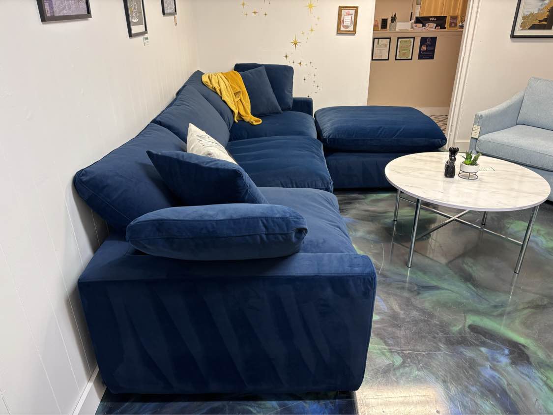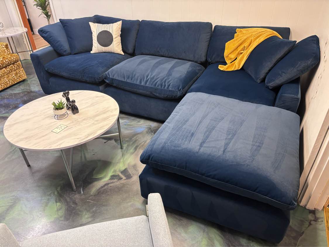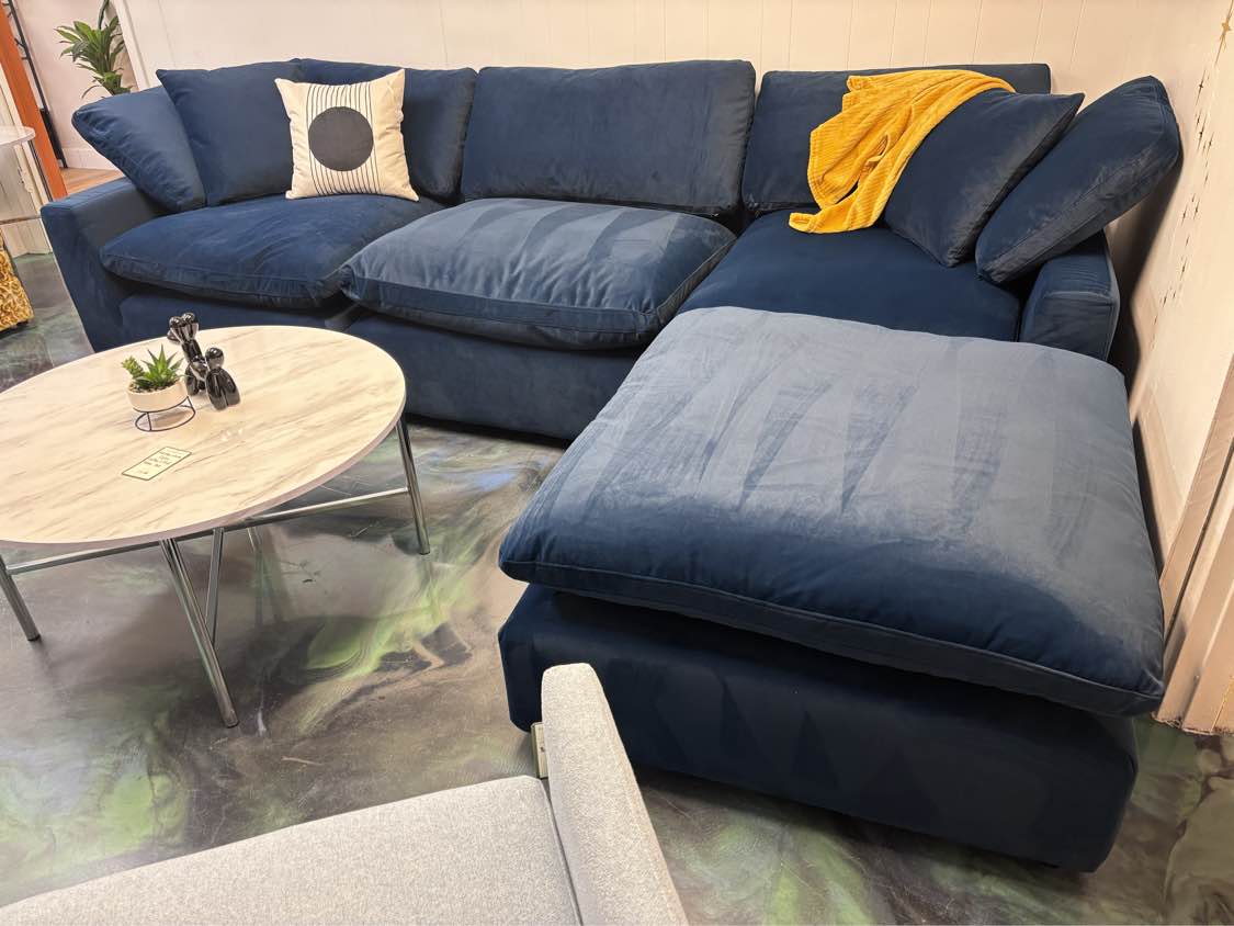 One of our own sectionals returning as a Restored babe! This gorgeous blue velvet is buttery to the touch and with the relaxed low back- this sectional is all about lounging and relaxation.
